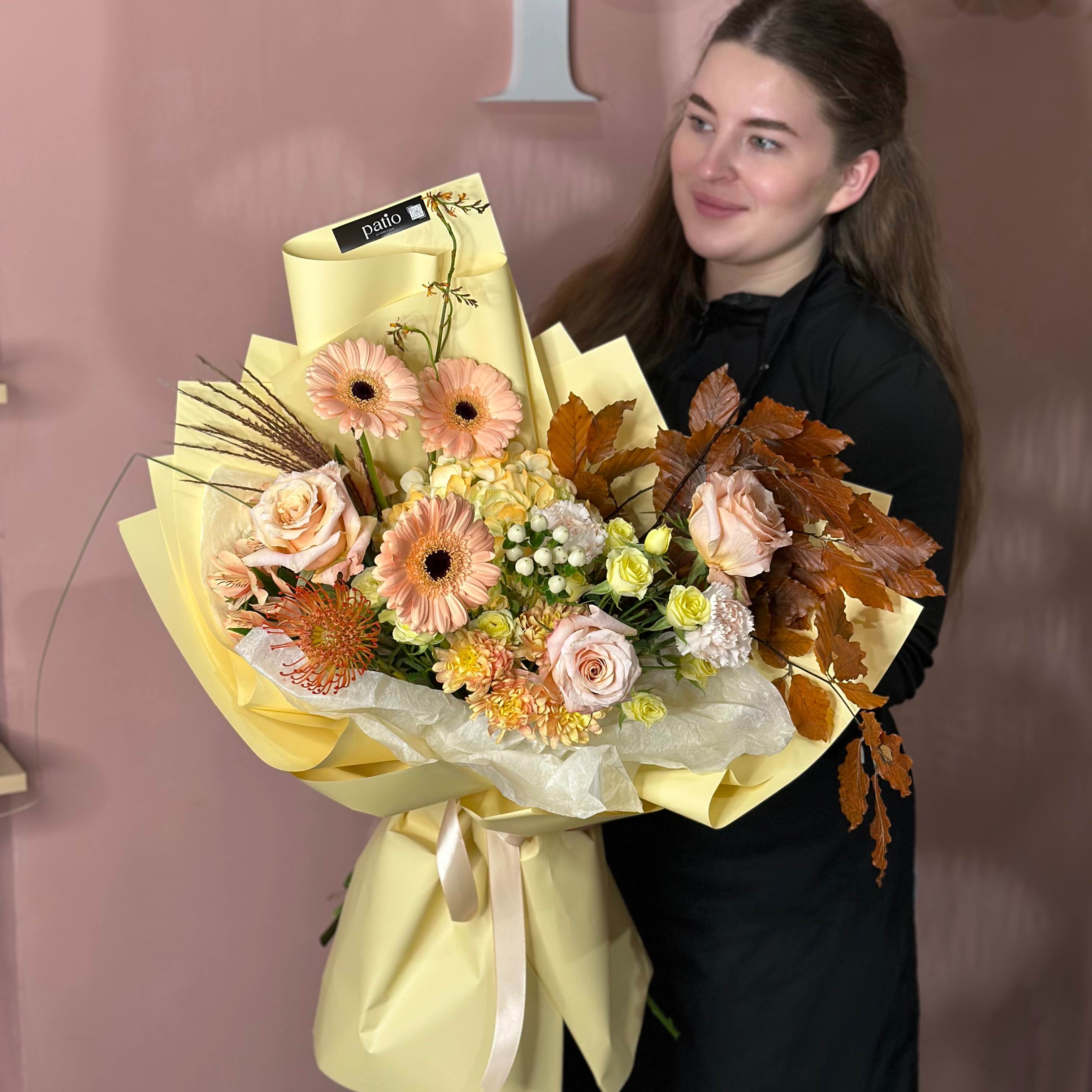 Неймовірно витончений, ніжний та водночас по-осінньому забарвлений букет, у складі якого: Гербери, голландські троянди, листя Бука, гортензія, кущові троянди, леукоспермум, крокосмія, дяантуси та альстромерія💛🧡